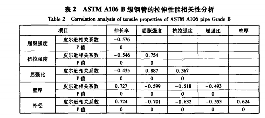根據AsTM A106標準要求,B級熱軋無縫鋼 管的機械性能應符合表l要求。歷史數據顯示,寶鋼以往生產的此類管件用 管的屈服強度為260一439加)a,均值為338.9 MPa, 標準差為23.77 MPa,其西格瑪水平為4.16;抗拉歷史數據顯示,寶鋼以往生產的此類管件用 管的屈服強度為260一439加)a,均值為338.9 MPa, 標準差為23.77 MPa,其西格瑪水平為4.16;抗拉采集了AsTM A106 B級鋼管的拉伸性能歷 史數據,進行相關性分析¨1(原假設為不相關,備 擇假設為相關,顯著性水平a取0.05),見表2。